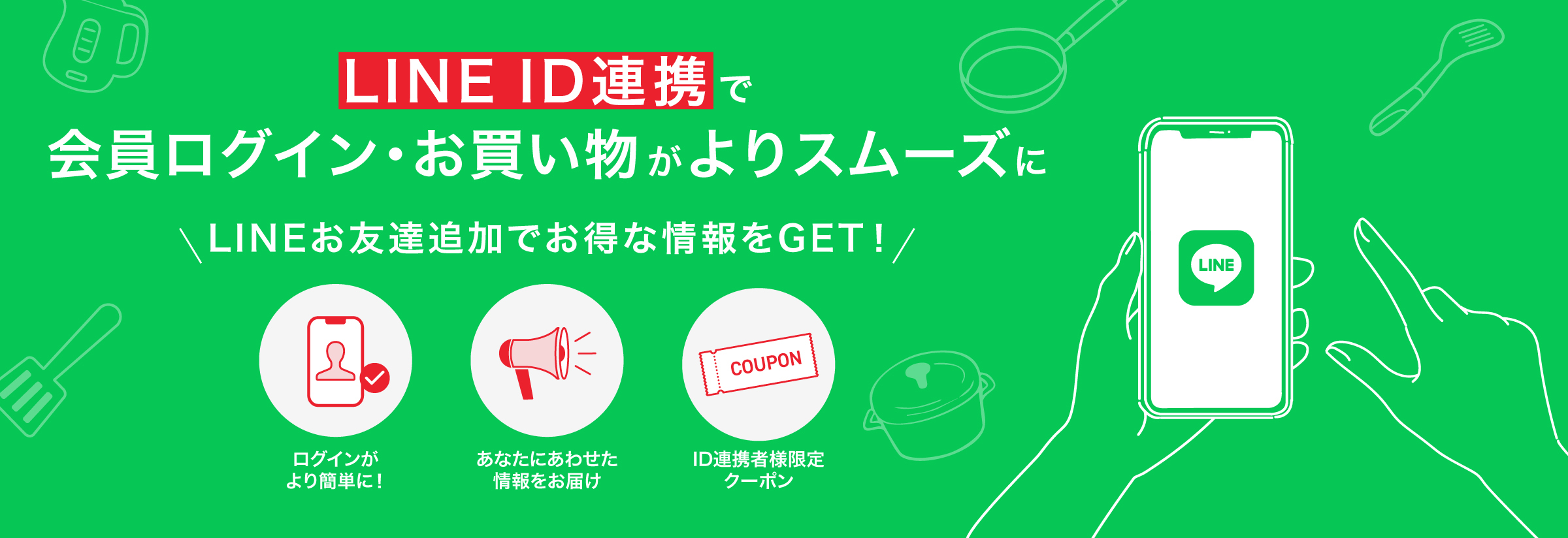 公式オンラインストアでご利用いただける、LINE ID連携者様限定のクーポンをお届けします。LINE ID連携でお買い物をよりお得にご利用いただけます。