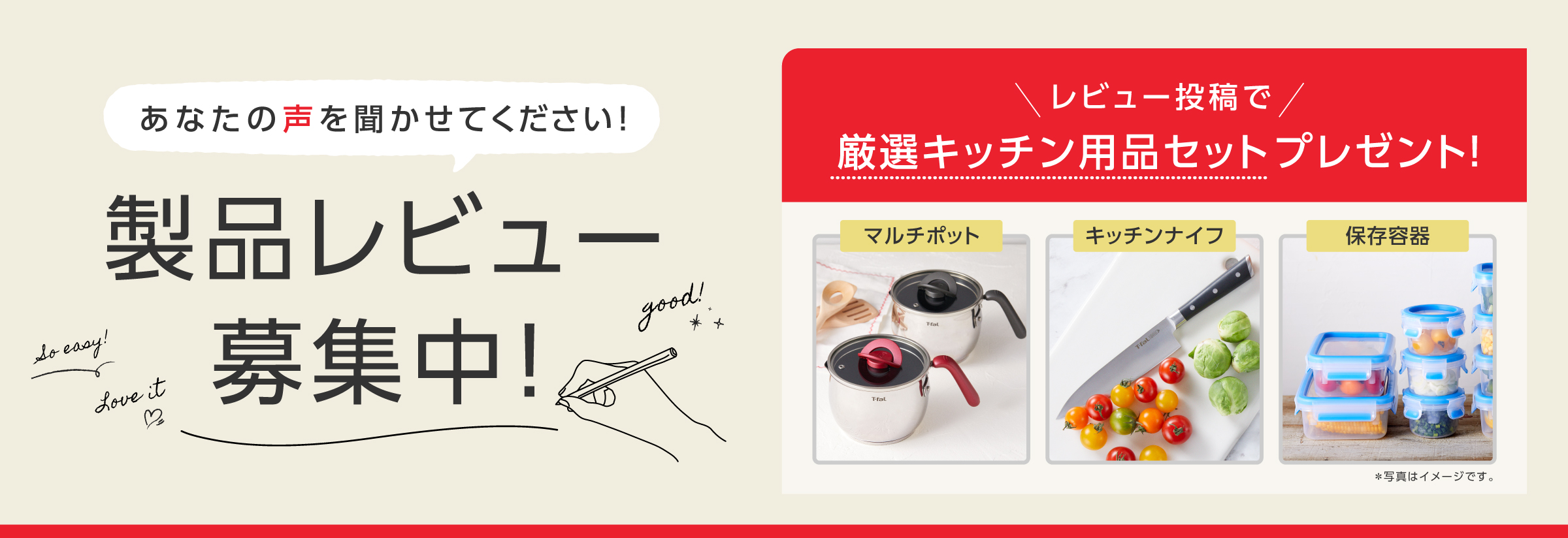製品レビューをご投稿いただいた方の中から期間中に抽選を行い、10名様にティファールの人気製品を集めた「厳選キッチン用品セット」をプレゼントいたします。