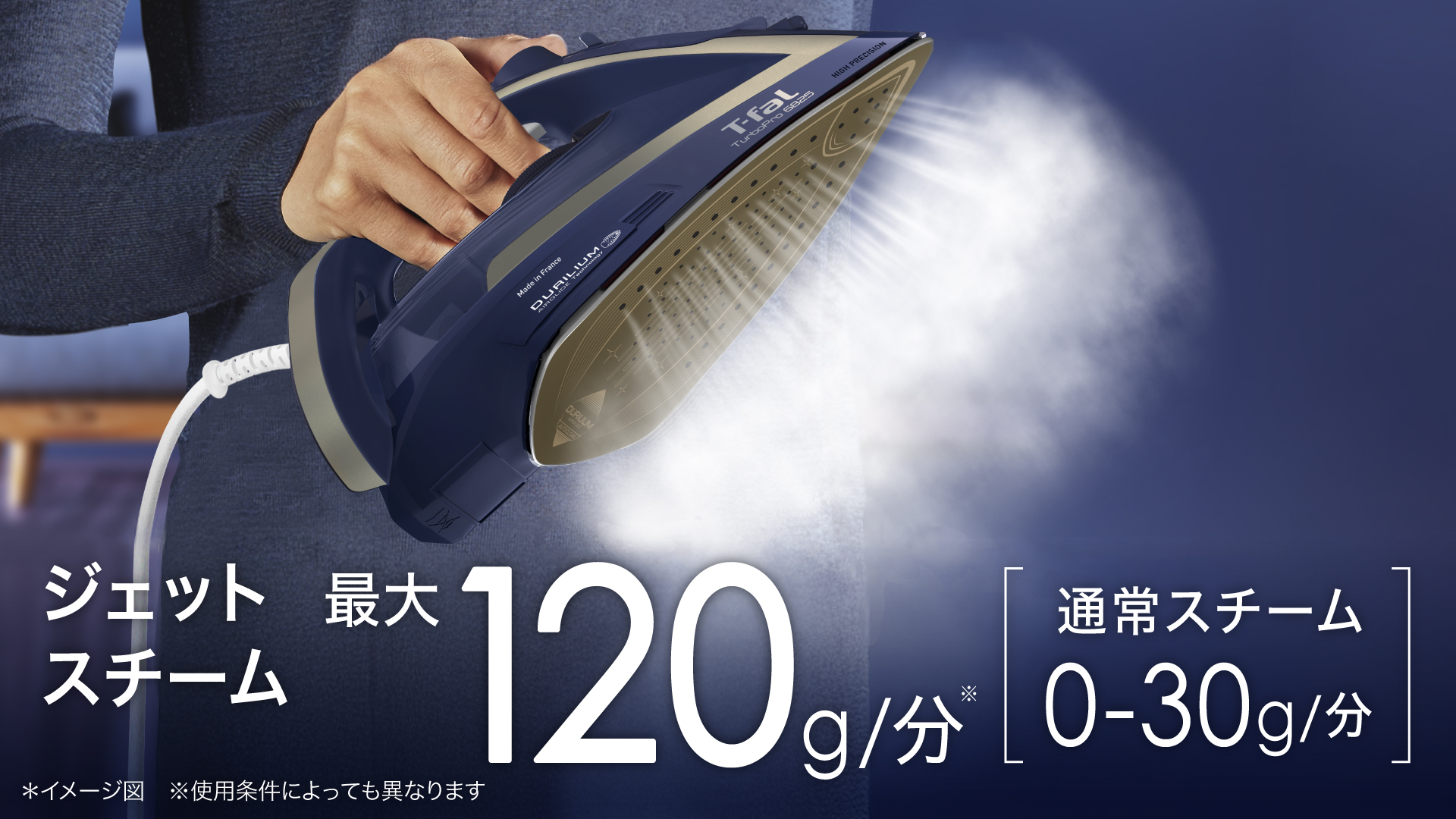 1分間に最大120g※のパワフルなジェットスチームを噴射。繊維の奥深くまで浸透し、頑固なシワの原因をサッとほぐす。