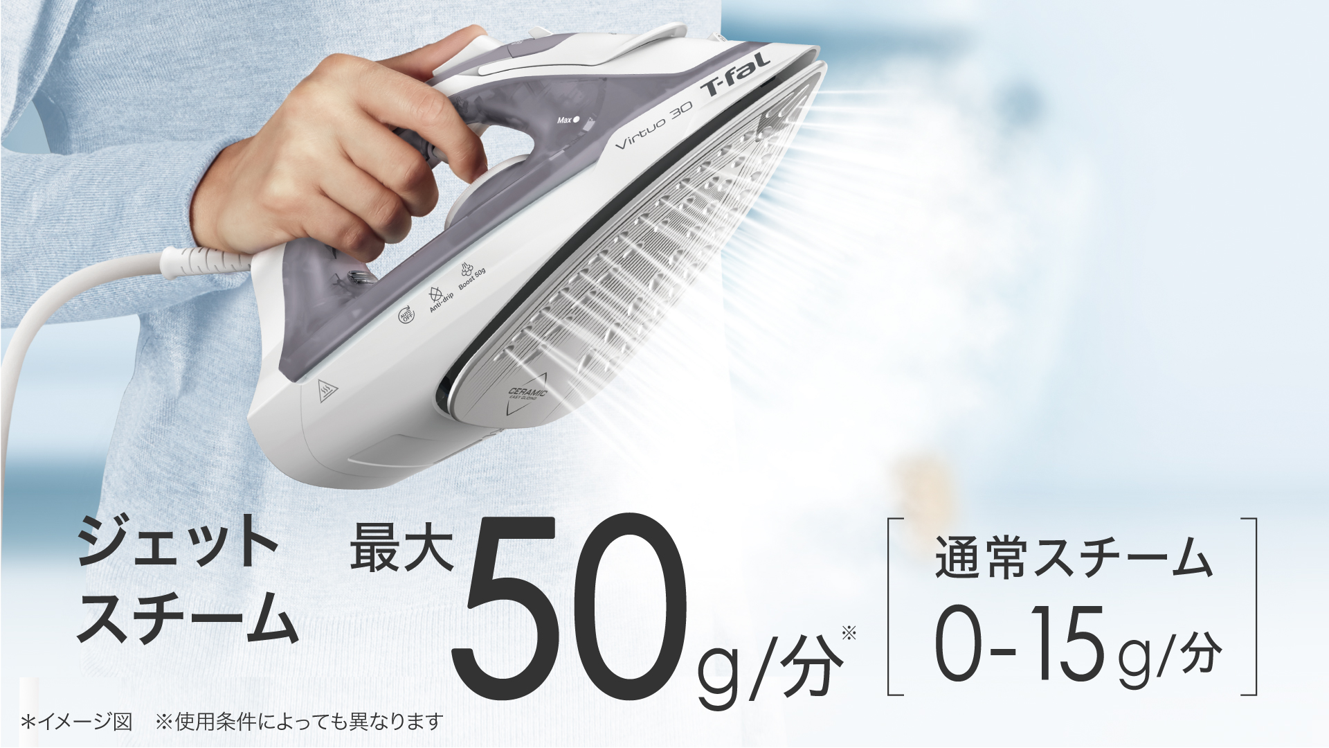 1分間に最大50g※のジェットスチームを噴射。繊維の奥深くまで浸透し、頑固なシワの原因をサッとほぐす。