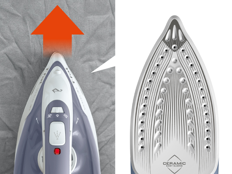 頑固なシワをのばすときに便利なワンタッチスプレー付き。アイロンをかけながらでも操作が簡単。