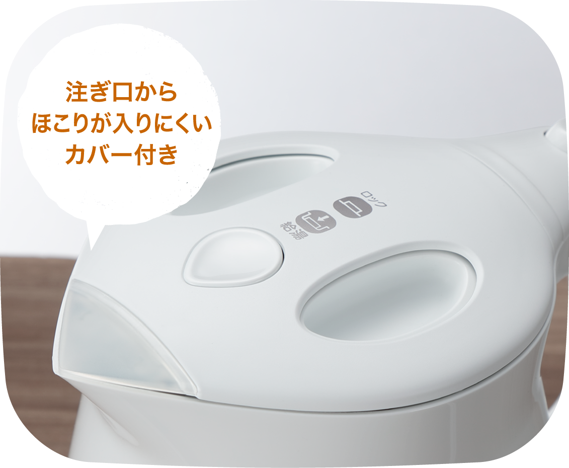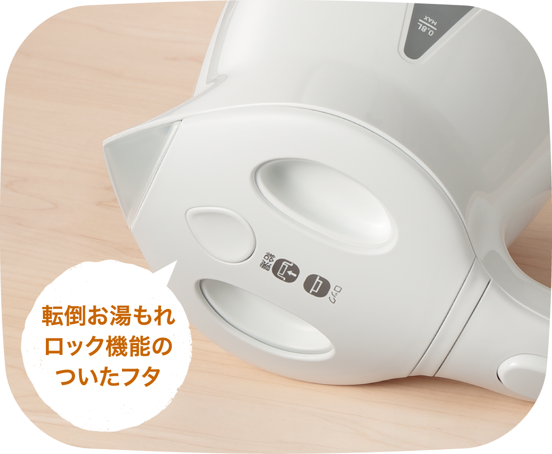 倒れてもお湯がこぼれにくいロック機能付きで、やけどなどの危険性を少なくします。