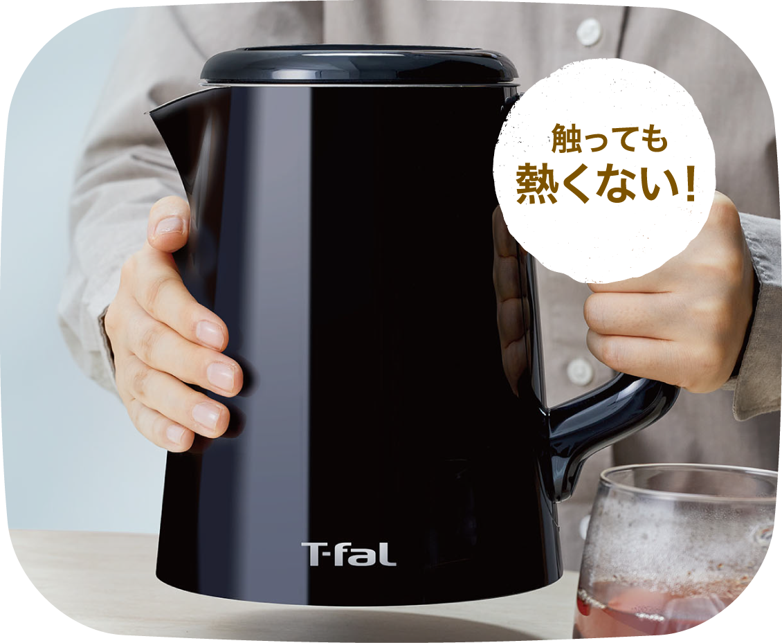 外はプラスチック、中はステンレスの2重構造。沸騰後不意に触れたときや、両手で持って注ぐときにも外側は熱くならないので安心してお使いいただけます。