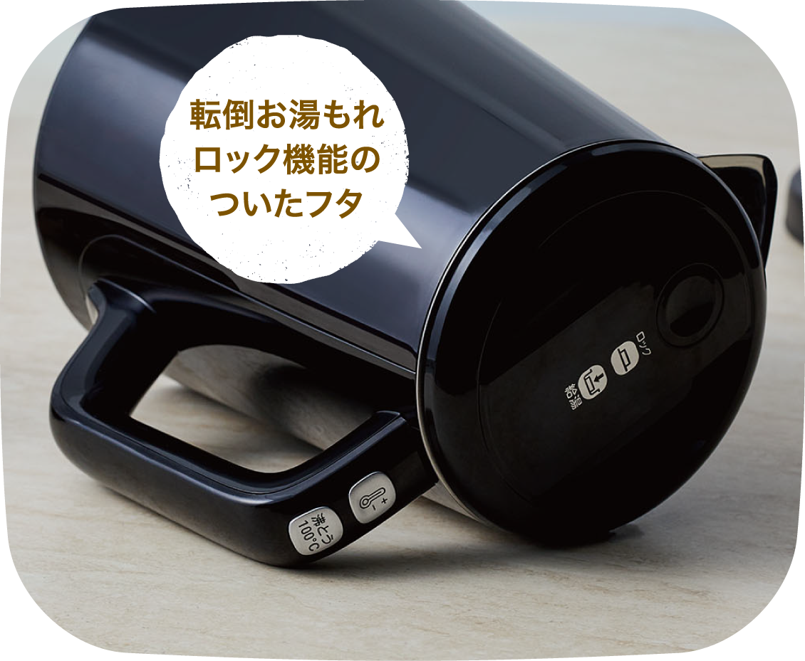 倒れてもこぼれにくいフタ付きで、やけどなどの危険性を少なくします。