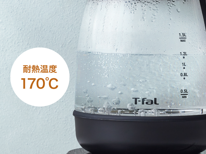本体は割れにくい耐熱ガラス。中が見えるので湯量や沸騰状態が分かりやすい。