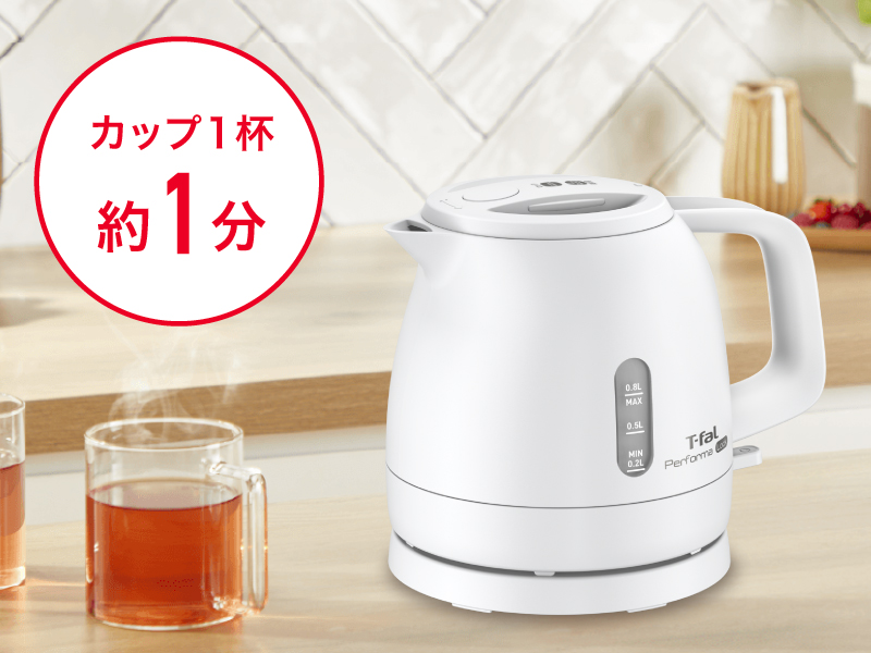 *水温・室温23度の条件で、記載量が沸騰するまでの時間。沸騰後、しばらくすると自動電源オフ機能が働きます。カップ1杯相当(約140mL)から沸かせますが、水量目盛のMINライン(200mL)以上でのご使用をおすすめします。