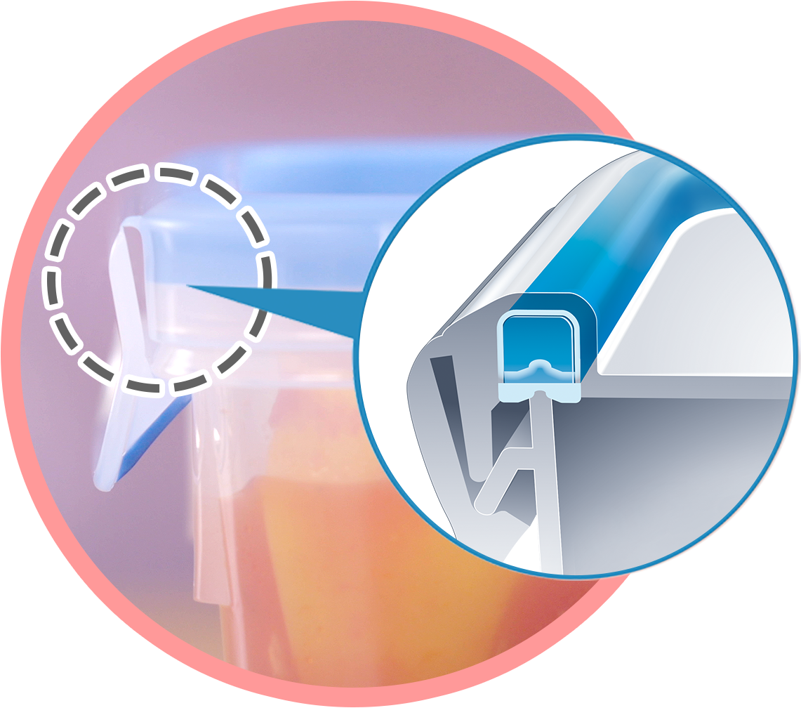 マスターシール フレッシュは、フタにパッキンが一体化した構造。従来のフタにパッキンをセットする保存容器に比べ、すき間なく密着するので、すぐれた密閉力を実現します。