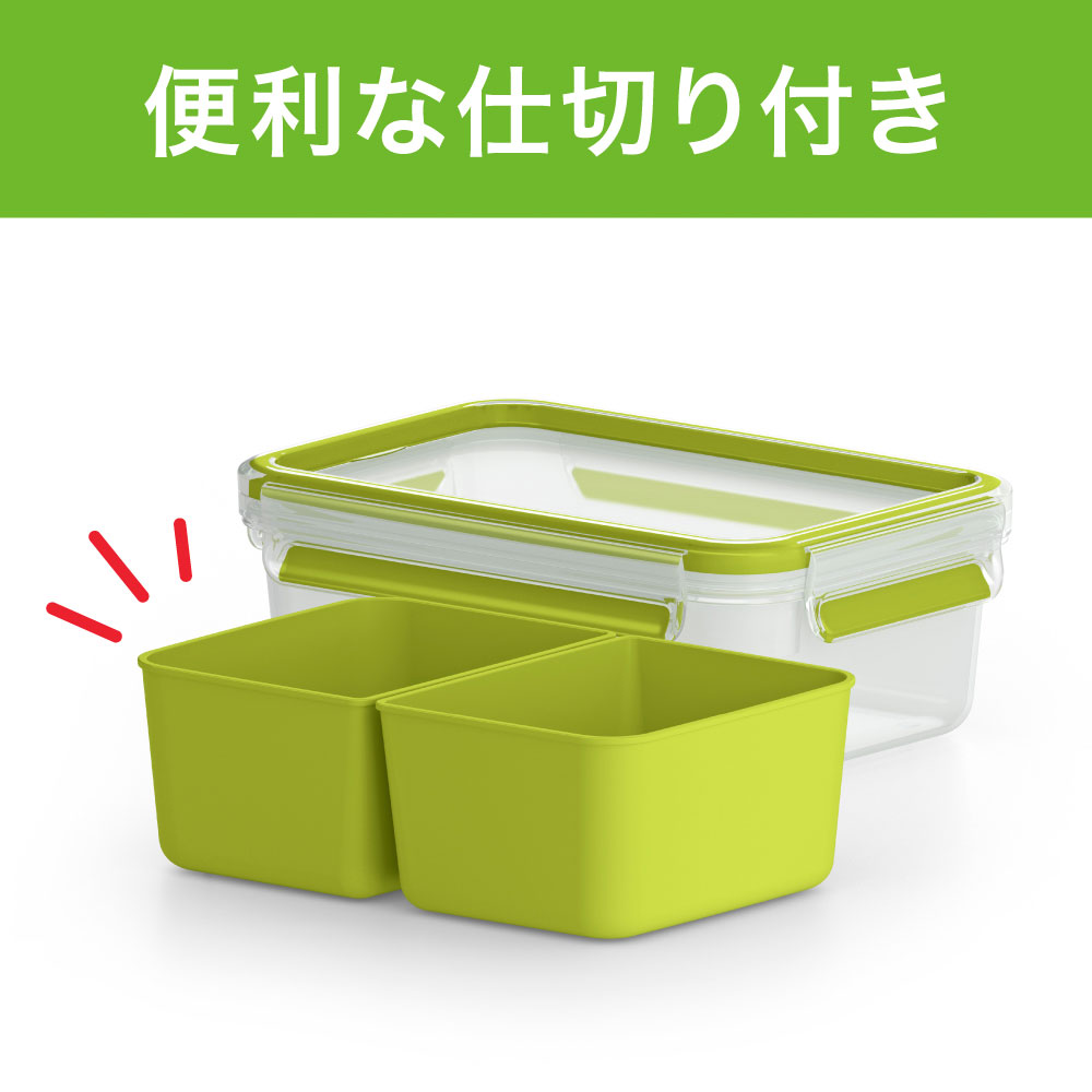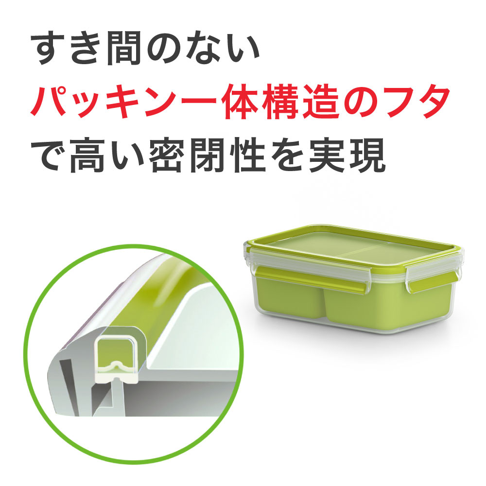| 特長 | すき間のないパッキン一体構造のふたで、もれない・清潔・新鮮さ長持ち。電子レンジOK つくりおきにぴったり! | すき間のないパッキン一体構造のふたで、もれない・清潔・新鮮さ長持ち。耐熱ガラス製で電子レンジ・オーブン調理OK | すき間のないパッキン一体構造のふたで、もれない・清潔・新鮮さ長持ち。仕切りがついているからお弁当にぴったり! |