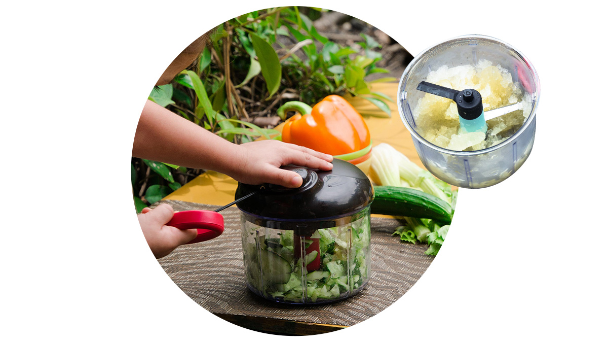 操作はハンドルを引くだけ。面倒なみじん切りがあっという間。簡単操作で、お子様でも楽しく料理のお手伝いができます。