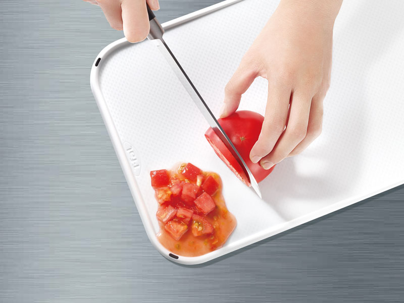 軽量、薄型!食材の汁がこぼれないカッティングボード。キッチンナイフの傷がつかないデザイン加工。食材により使い分けられるリバーシブルタイプ