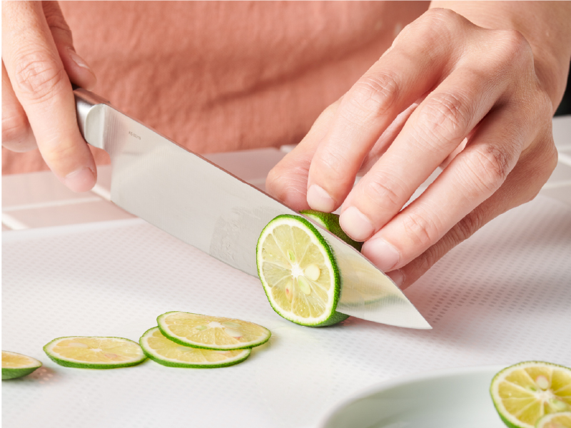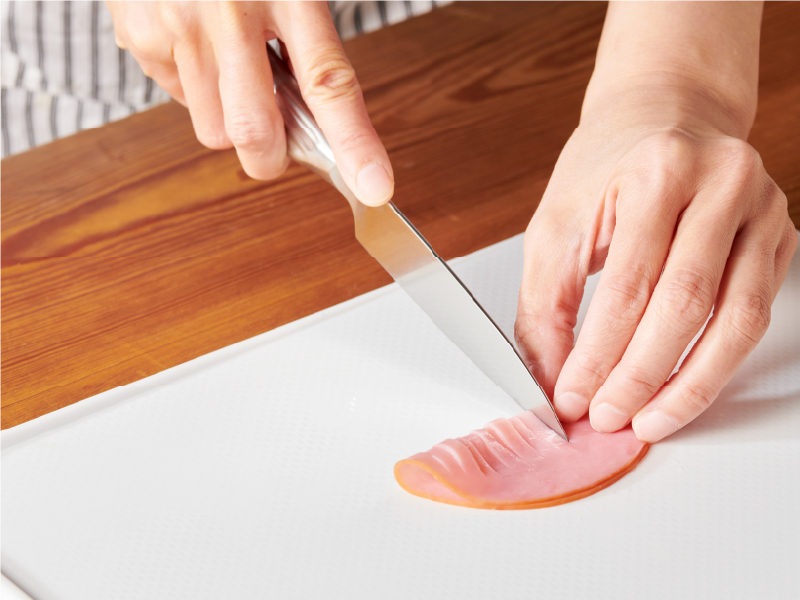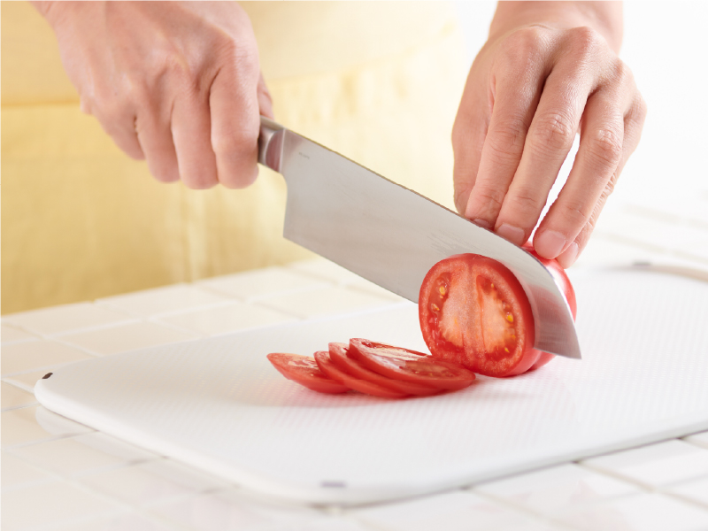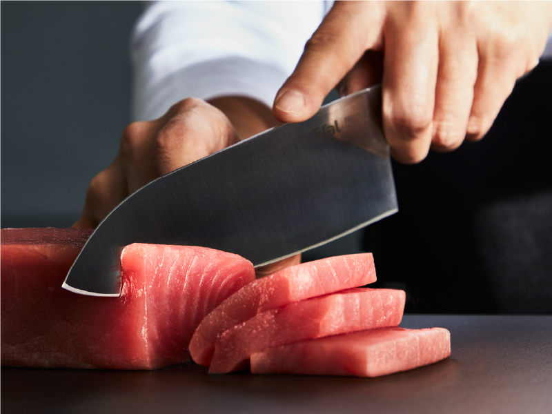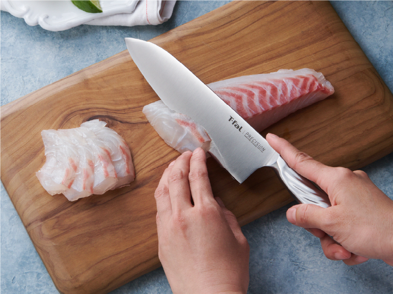 「プレシジョン」の鋭角な刃先は、お刺身などの繊細な食材もシャープにカットできるので、食感を損なわずおいしさを最大限に引き出すことができます。