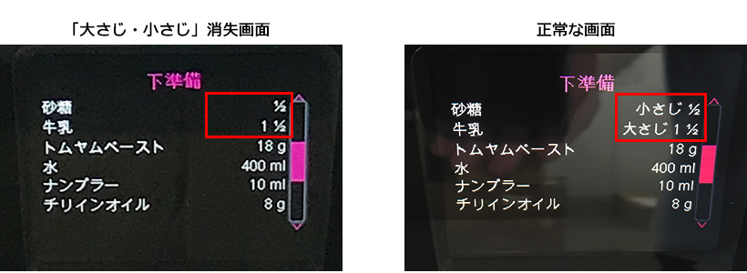 本製品は、レシピ工程を伝える画面を見ながら調理を行うことができる調理家電ですが、料理に必要な材料を用意する「下準備」の工程におきまして、一部の製品において「大さじ・小さじ」の表示が消失するという現象が起こっております。本症状については、内蔵150レシピの中で「大さじ・小さじ」の表示のある137レシピ全てに見受けられる症状となっております。