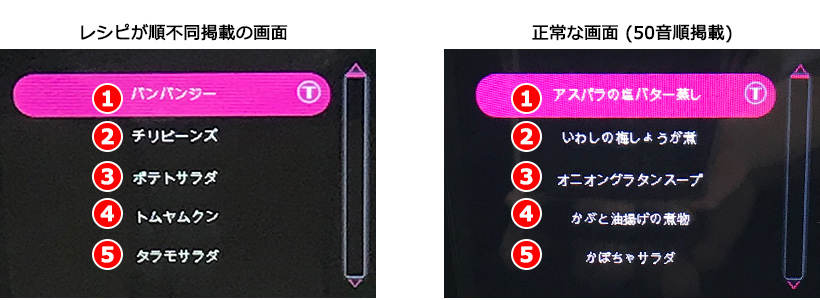また、通常のレシピの掲載順は50音順となっておりますが、順不同に掲載されている現象も起こっております。