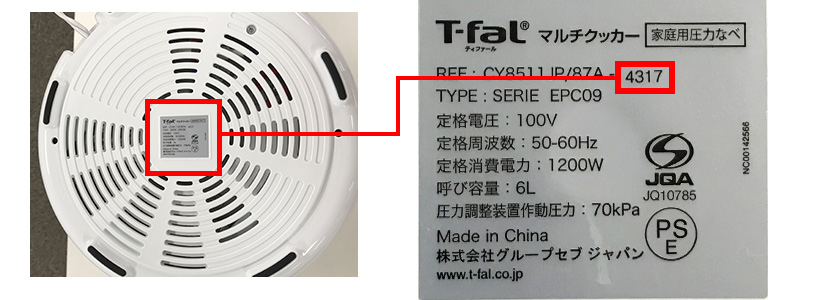 お持ちのクックフォーミー エクスプレスの本体底面のステッカーの4桁の番号で確認することができます。
