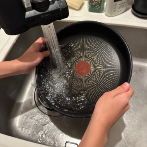 フッ素樹脂のコーティングで食材がくっつきにくく、少量の油で調理できます。さらに、汚れが落ちやすく、お手入れも簡単です。