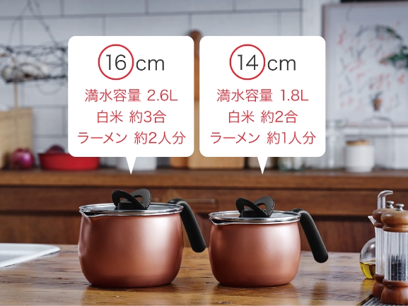 キッチンを彩る豊富なカラーバリエーションに加え、使いやすく便利な16cmサイズと、さらにコンパクトな14cmサイズ。あなたはどちらのマルチポットにする?