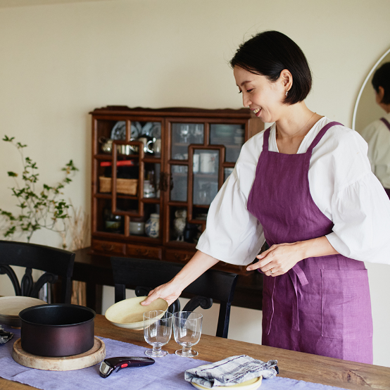 フランスの家庭では、お菓子を手作りするのは一般的。友人や家族が集まる時には、自慢の料理とデザートでもてなすそう。マチューさんの生まれ育ったパリ郊外の家はキッチンも広く、母と一緒に料理を楽しんだ記憶がいっぱい。「ただ、パリの中心エリアは東京と同じくキッチンが小さいので、調理道具の収納も大変。その点でも『取っ手のとれるティファール』はすごく便利だなと感じました。取っ手をとれば、フライパンや鍋をオーブンに入れられるし、テーブルにもそのままサーブできるデザイン。ひとつの道具だけでいろんなスイーツを作れるから、時間も場所も問わない。お菓子作りの楽しみを広げてくれると思います」