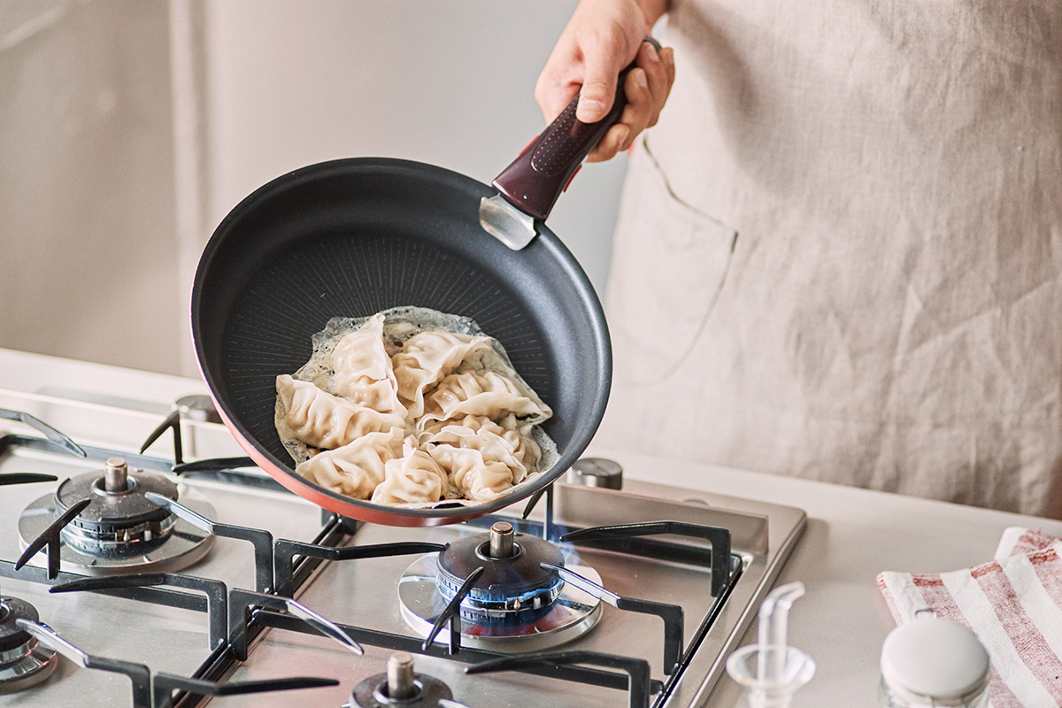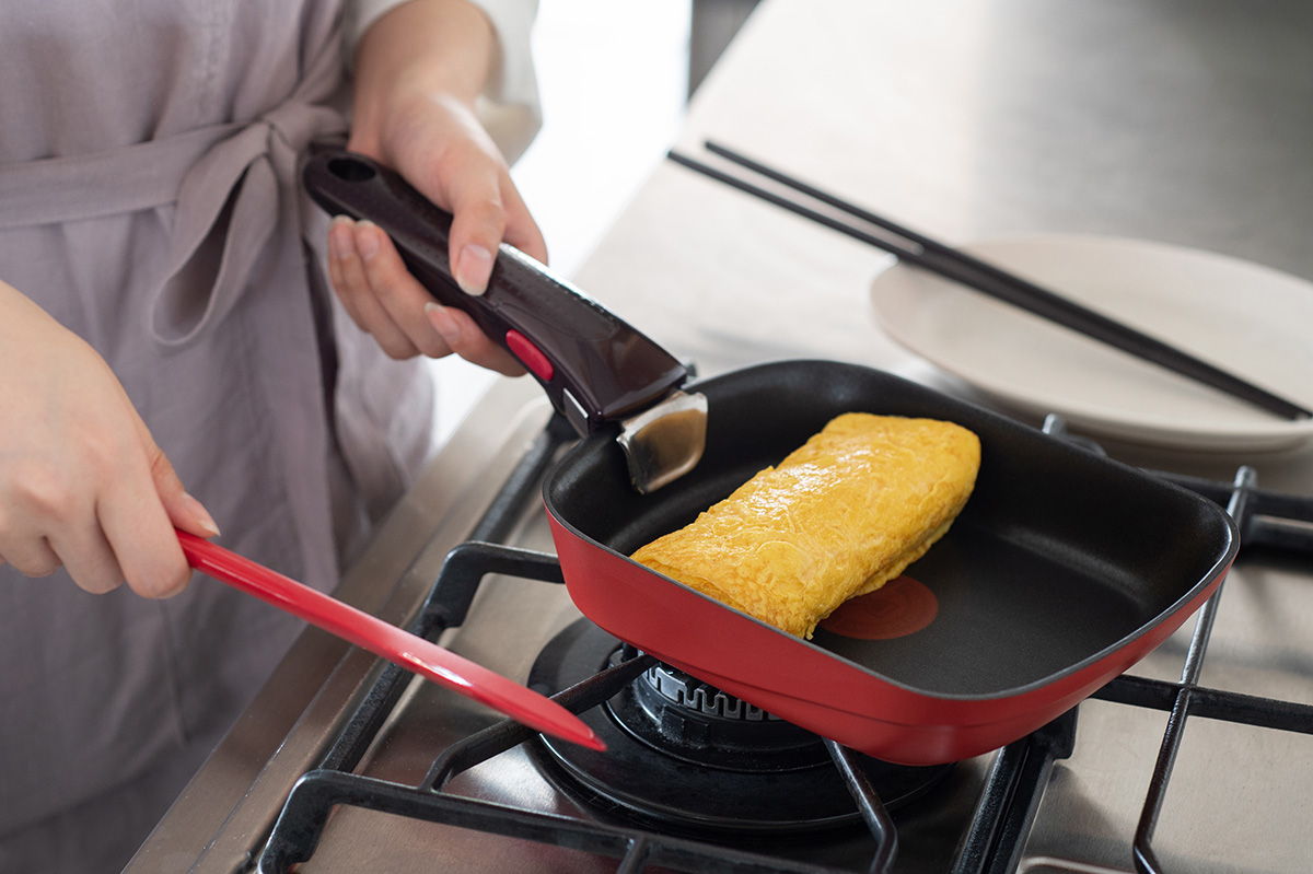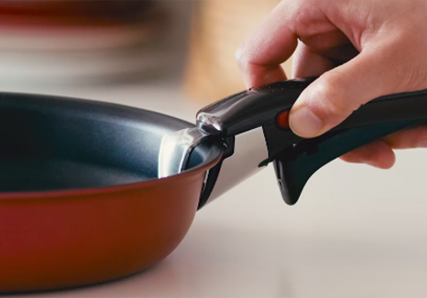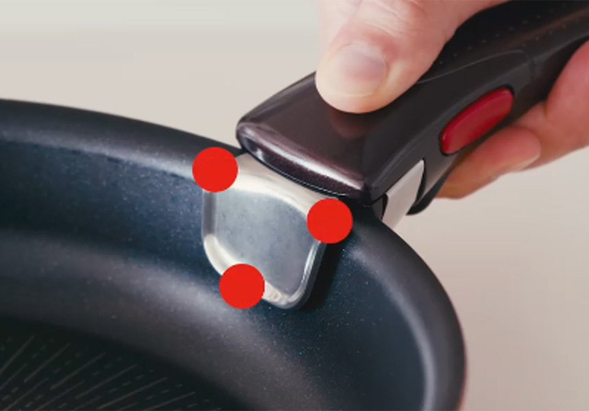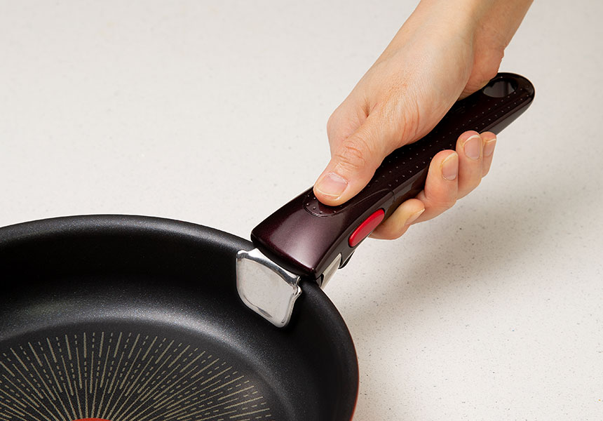 取っ手を握れば固定、両サイドのボタンを押すと解除。ティファールなら片手ワンタッチ脱着だから、調理中の付け外しも簡単。