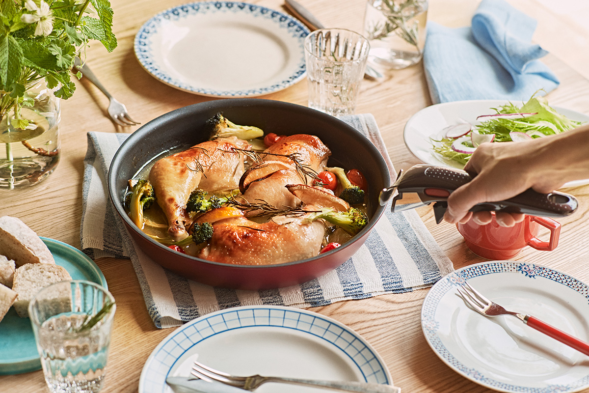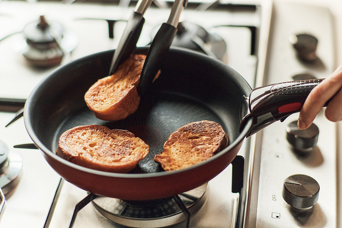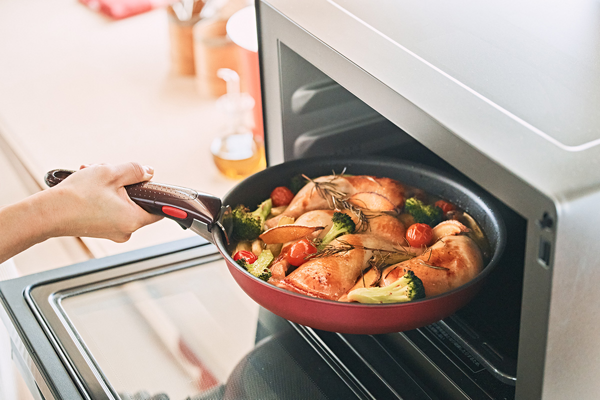 取っ手を握れば固定、両サイドのボタンを押すと解除。ティファールなら片手ワンタッチ脱着だから、調理中の付け外しも簡単。