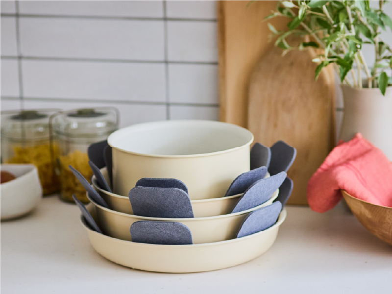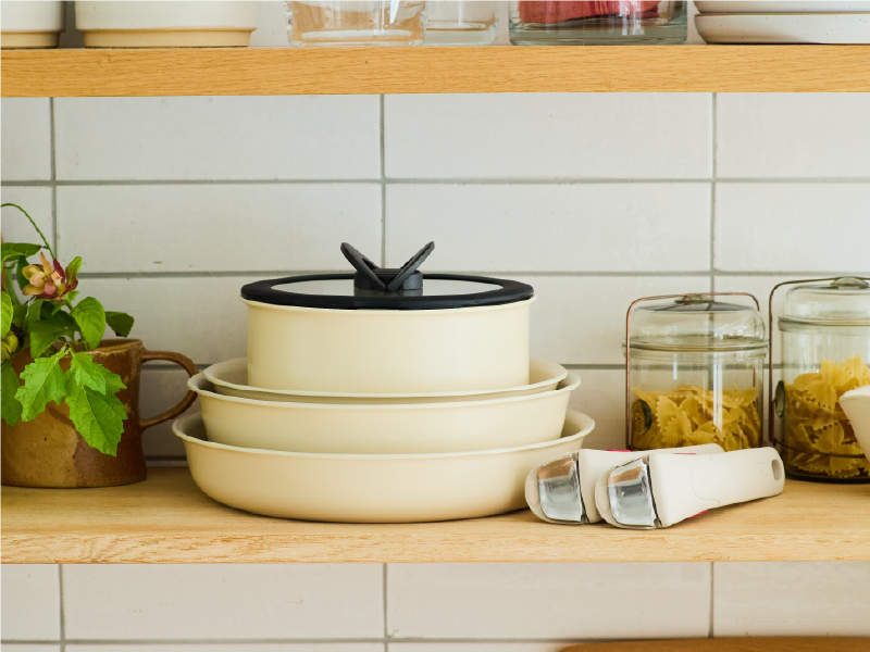取っ手がとれるから重ねて収納できる。フライパン一枚分のスペースに収まり、すっきりとしたキッチンを実現します。