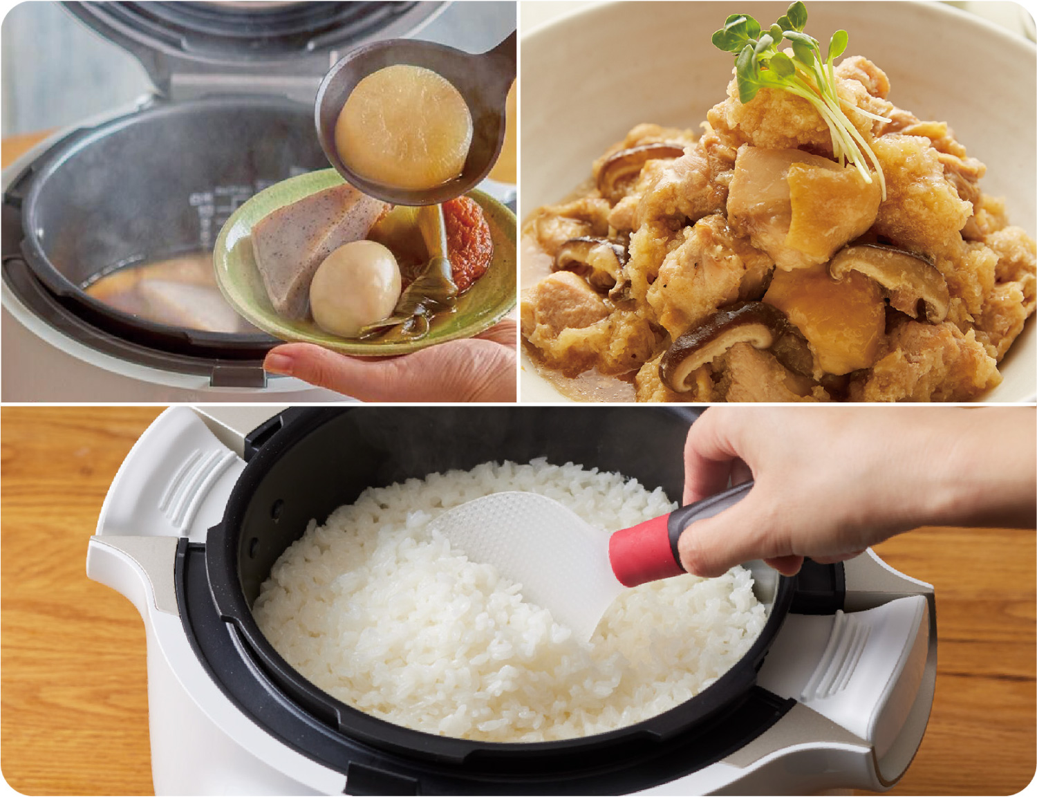 おでかけ前に食材をセットして調理をスタートすれば、帰宅する頃には、おいしくできあがり。低温でじっくりと煮込むので、味がしっかりと染み込んだ仕上がりに。