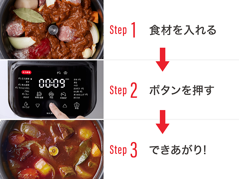 高温で調理する圧力調理がボタンひとつででき、普通の鍋と比べて時間を短縮。時間がない時や時間のかかる煮込み料理があっという間に完成します。