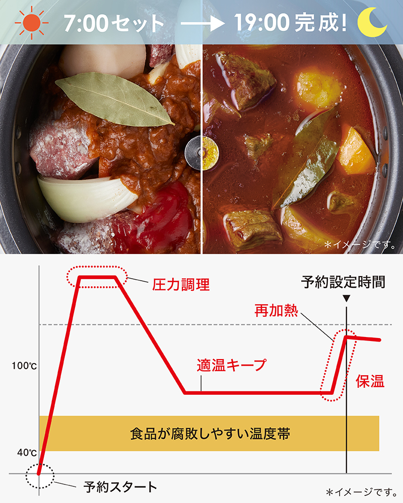 食材を入れて、予約開始後すぐに調理スタート。スマート予約調理*により調理後は食材に最適な温度を保ち、最後の仕上げで再加熱し、予約した時間にできあがり。帰宅時間を見込んでセットしておけば、できたてアツアツの料理を楽しめる。