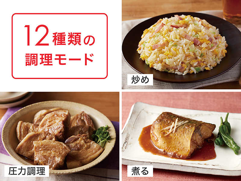 | 特長 | 「かきまぜパドル」搭載の圧力機能付き自動調理鍋。自動でまぜてくれるから、圧力調理も、炒めも、煮つめも、驚くほどさらにラクにおいしく | 多彩な調理モードを活用して、自分で料理の仕上がりをカスタマイズ可能。時短料理から本格料理まで幅広い料理が作れるベーシックモデル。お手入れしやすくリニューアル | シリーズ最小・最軽量。小さめサイズの本体でキッチンスペースが広がる。1台10役の多彩なモードが搭載され、レパートリーも広がる |