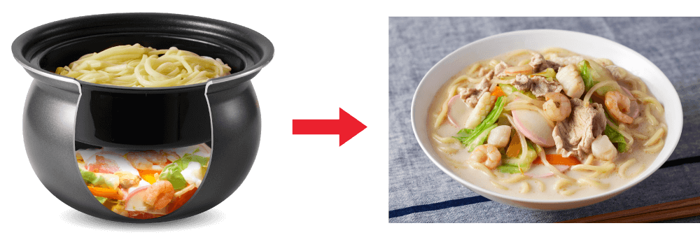 例えば、おかず+スープ、麺+具材などを同時に調理できるので、調理ごとに調理器具を用意したり、時間を使うことなく調理ができます。