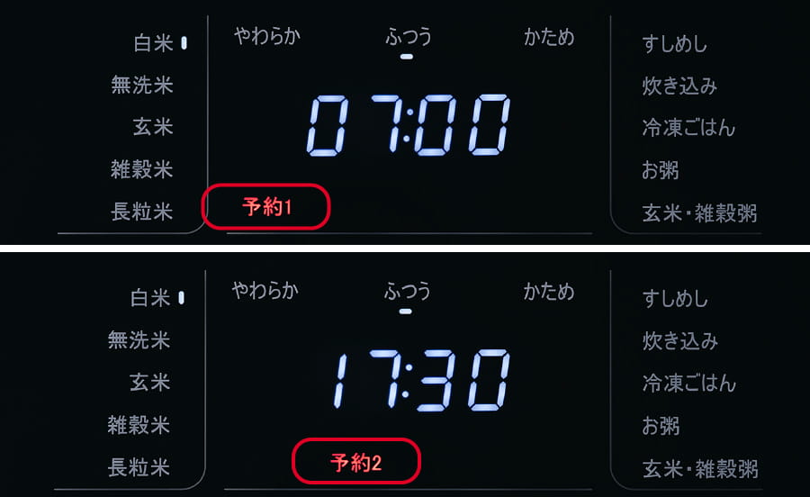 2つの時刻を登録できるので、朝ごはん・夜ごはん等、よく使う時刻をセットしておくと、ワンタッチで予約炊飯が簡単に