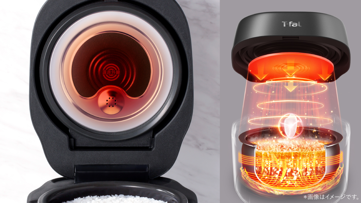 ティファール独自のふたから放出される遠赤外線が一粒一粒のお米に直接熱を届け、本体に設置された高火力IHが釜の下部からしっかりと包み込むように素早く炊き上げ、粒立ちの良い、旨みの凝縮したごはんができあがります。一般的なIH炊飯器や圧力IH炊飯器との違いとは?