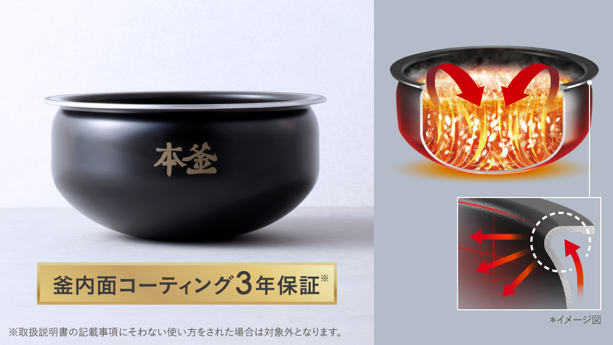 厚さ約2mmの釜は、上下に角度を施した形状と、発熱効率と熱伝導に優れた材質で、大きな熱対流を促し、おいしさをさらに引き出します。内側は、お米がこびりつきにくいコーティングが施されているので、お手入れも簡単です。