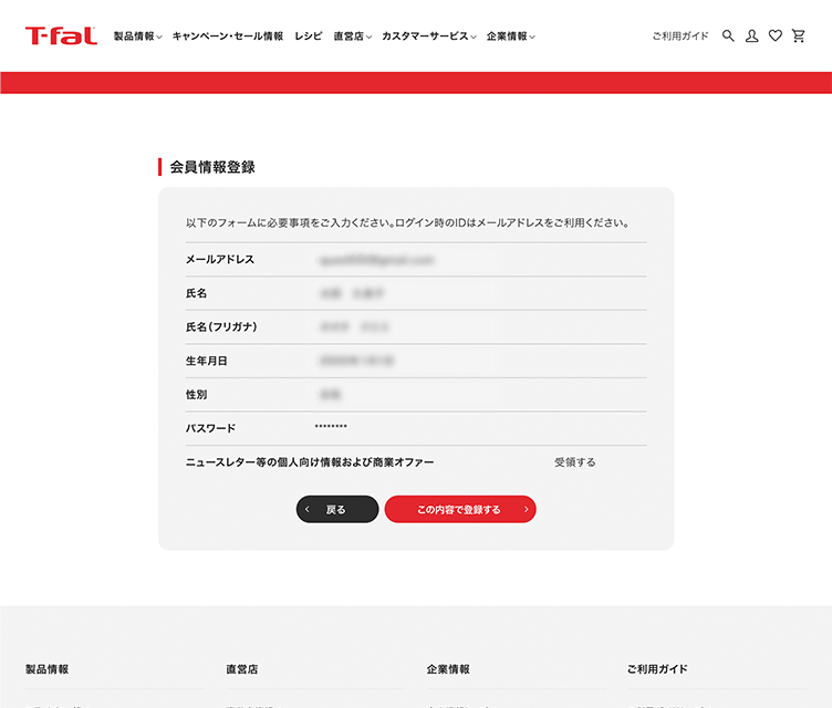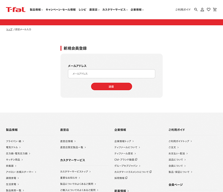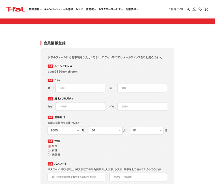 お客様情の会員情報をご入力ください。 ご登録いただくお客様の個人情報の利用目的および管理等の取り扱いにつきましては、「利用規約」ならびに「プライバシーポリシー」に定めておりますので、必ずご確認ください。 会員登録いただいた皆様へティファールの最新ニュースやお得なセール情報、暮らしのアイディアなどをお届けいたします。会員規約についての詳細をお読みいただき、「会員規約について同意する」に必ずチェックを入れてから「入力内容を確認」をクリックしてください。