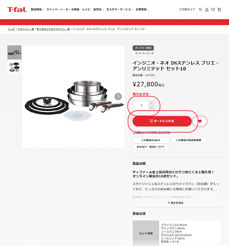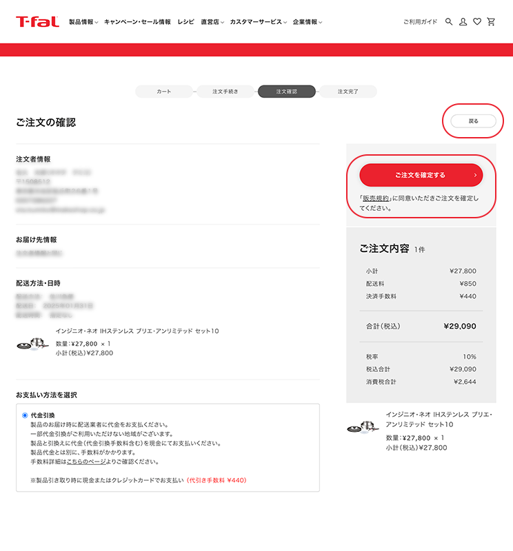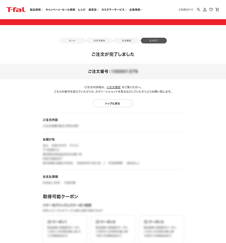 ご注文手続きが完了いたしますと、ご注文完了画面にて「注文番号」が表示され、ご登録のメールアドレスに<info@t-fal-official.jp>より「注文完了」メールが配信されます。