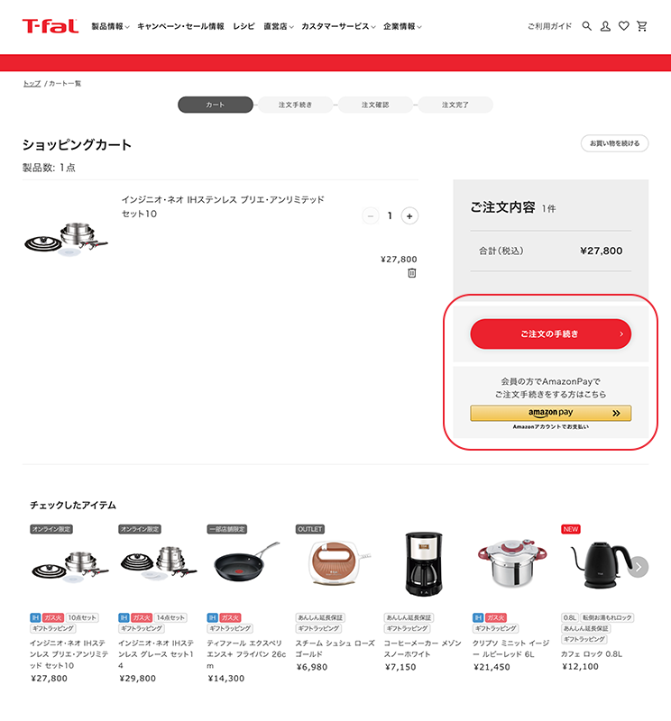カートページに遷移し、製品が追加されていることをご確認ください。全てのご注文製品が決まりましたら、「ご注文の手続き」をクリックしてください。また、Amazon Payをご利用の方は「Amazon Pay」ボタンをクリックの上、手続きにお進みください。
