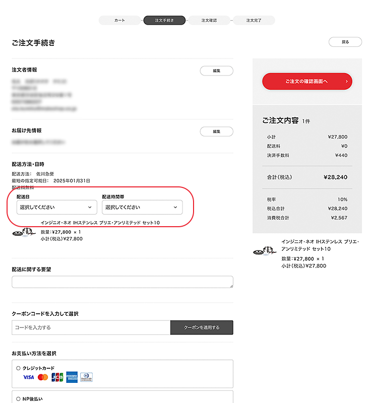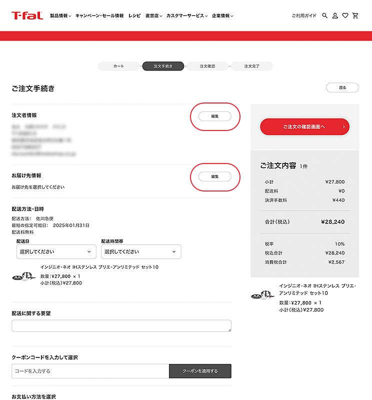 注文者情報およびお届け先情報の「編集」にて、必要情報をご入力ください。注文者情報とお届け先情報が異なる場合は、新しいお届け先を追加いただくか、ご登録済みのお届け先をご指定ください。