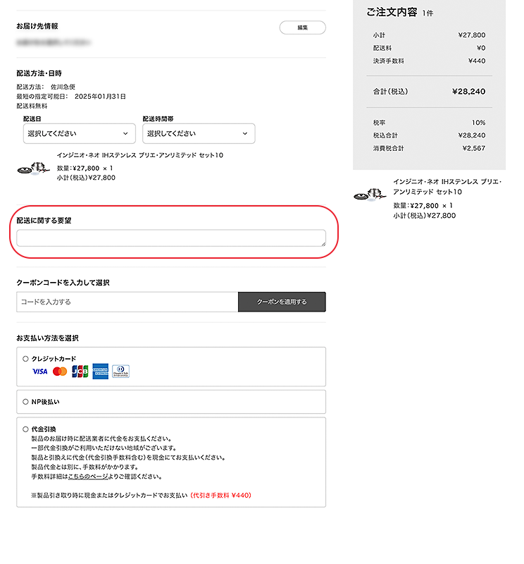 お届けに関するご要望がございましたら「配送に関する希望」の空欄にご記入ください。